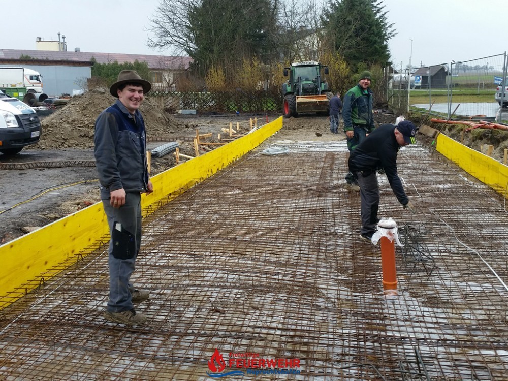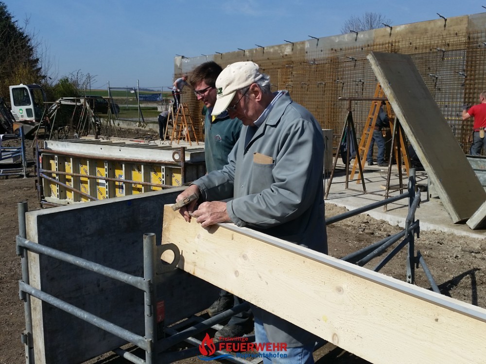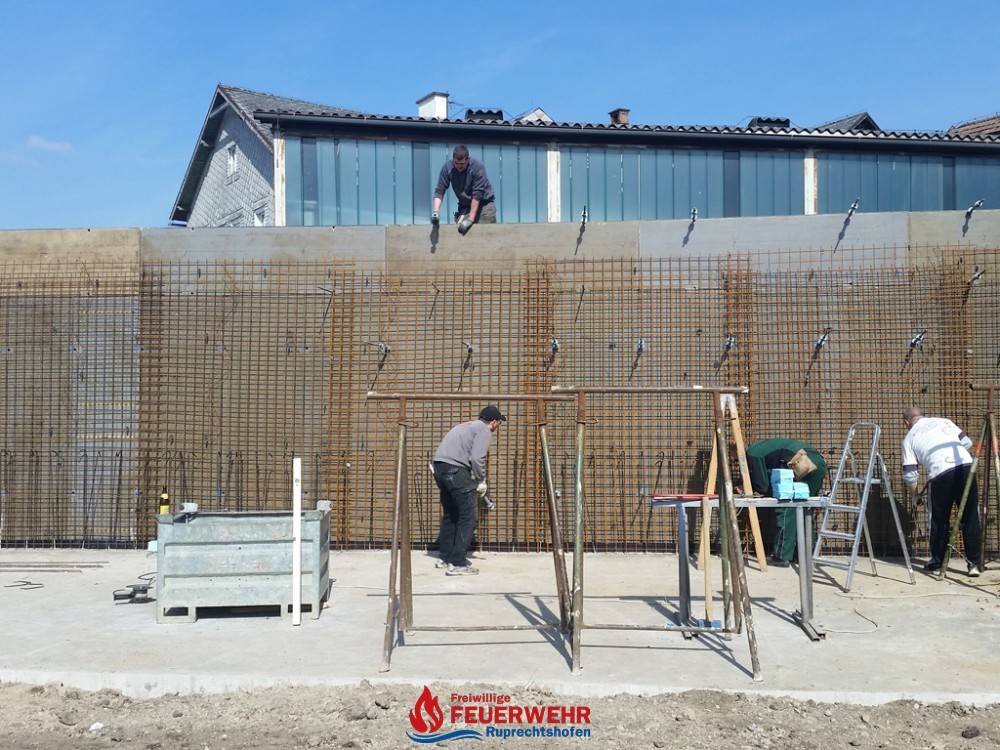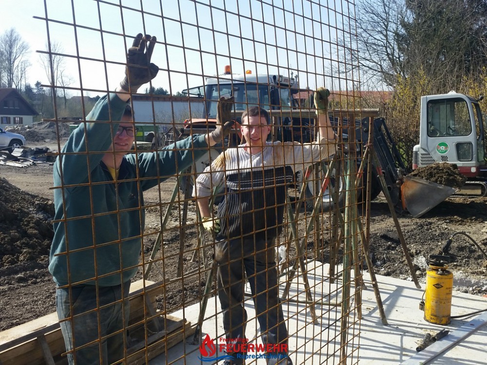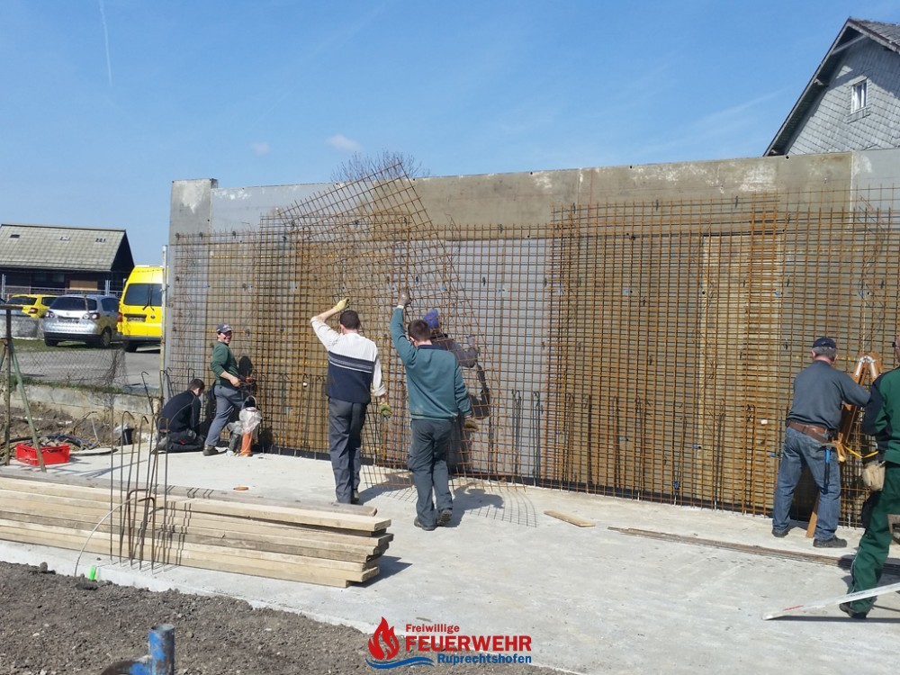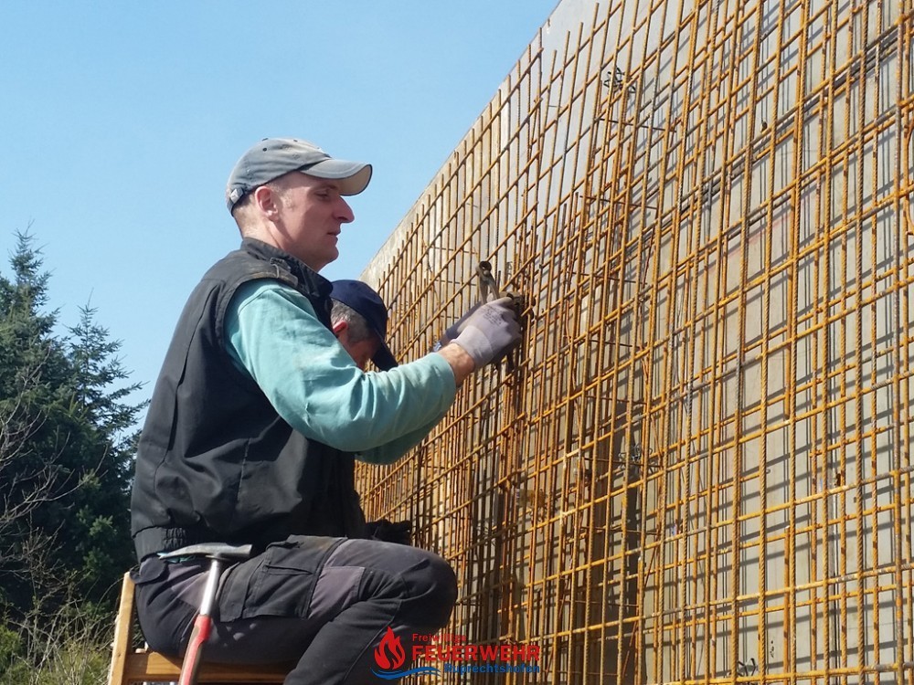 Am Samstag, den 25. März meinte es der Wettergott gut mit allen Helfern auf der Feuerwehrzubau – Baustelle. Die Schalung für die Rückwand der Halle wurde aufgestellt und das Bewährungseisen eingebunden.