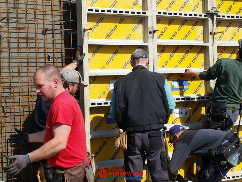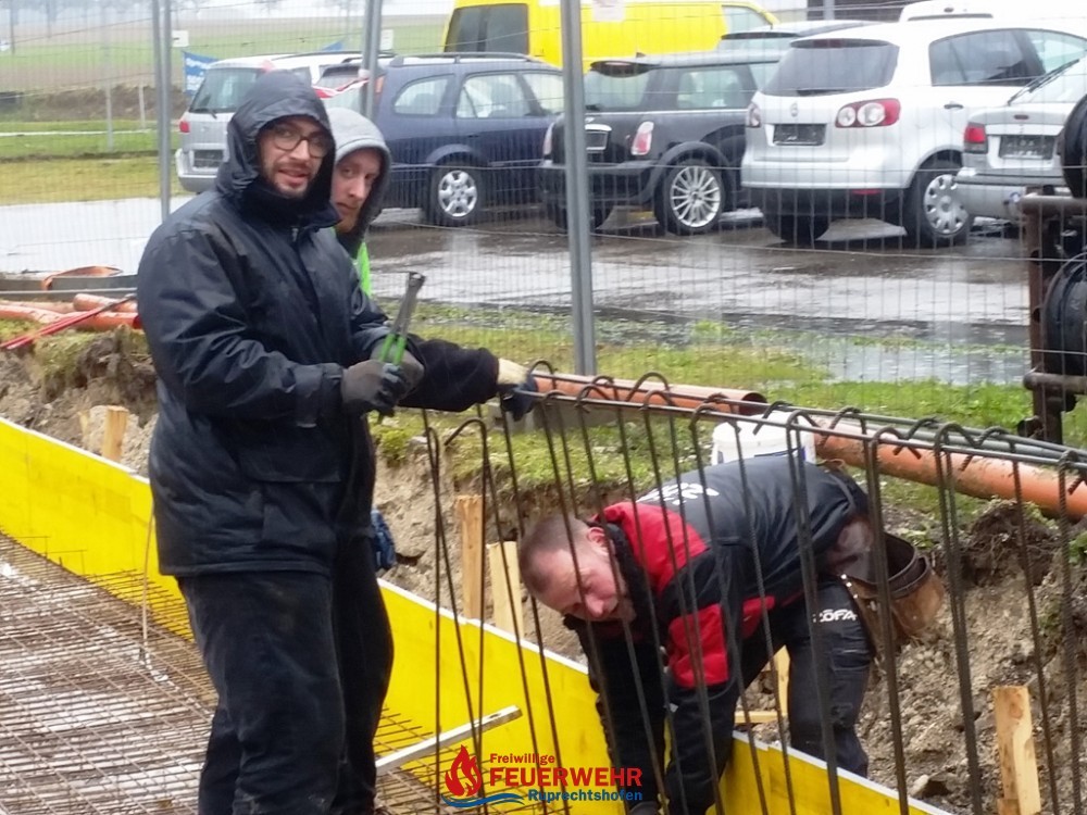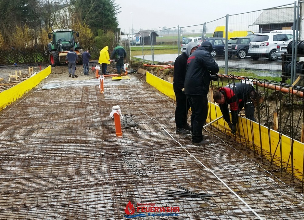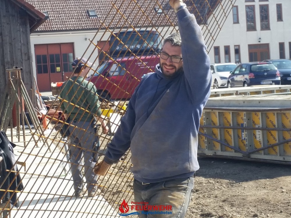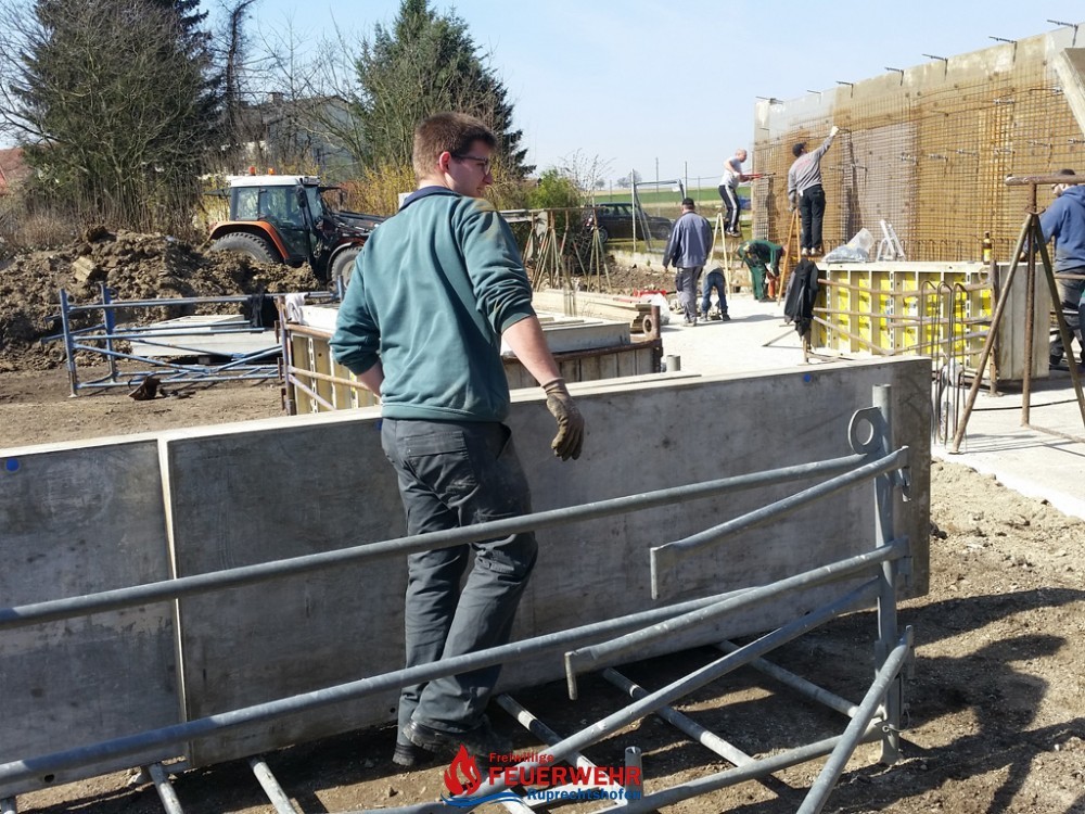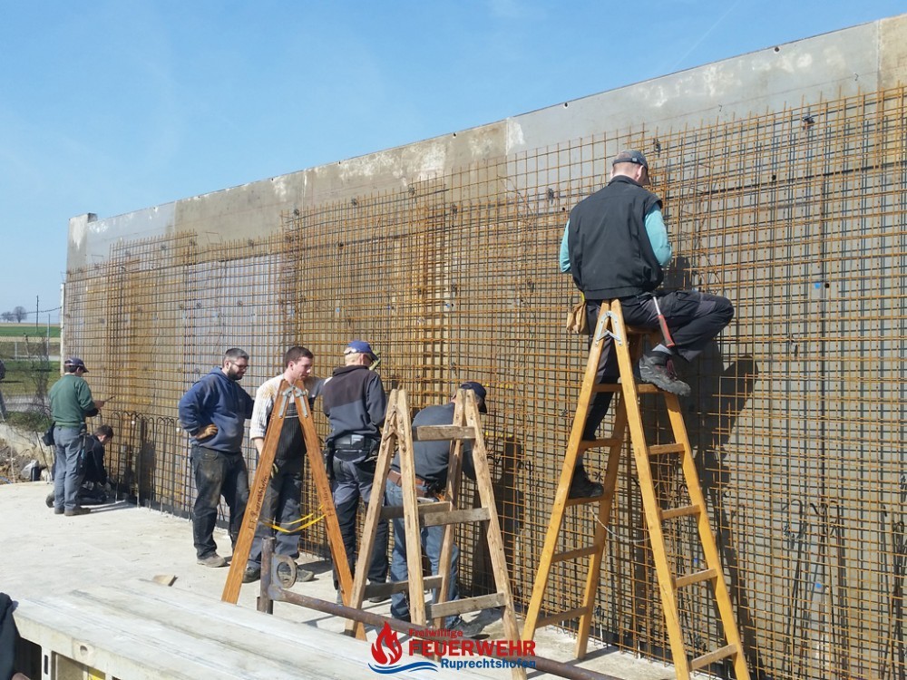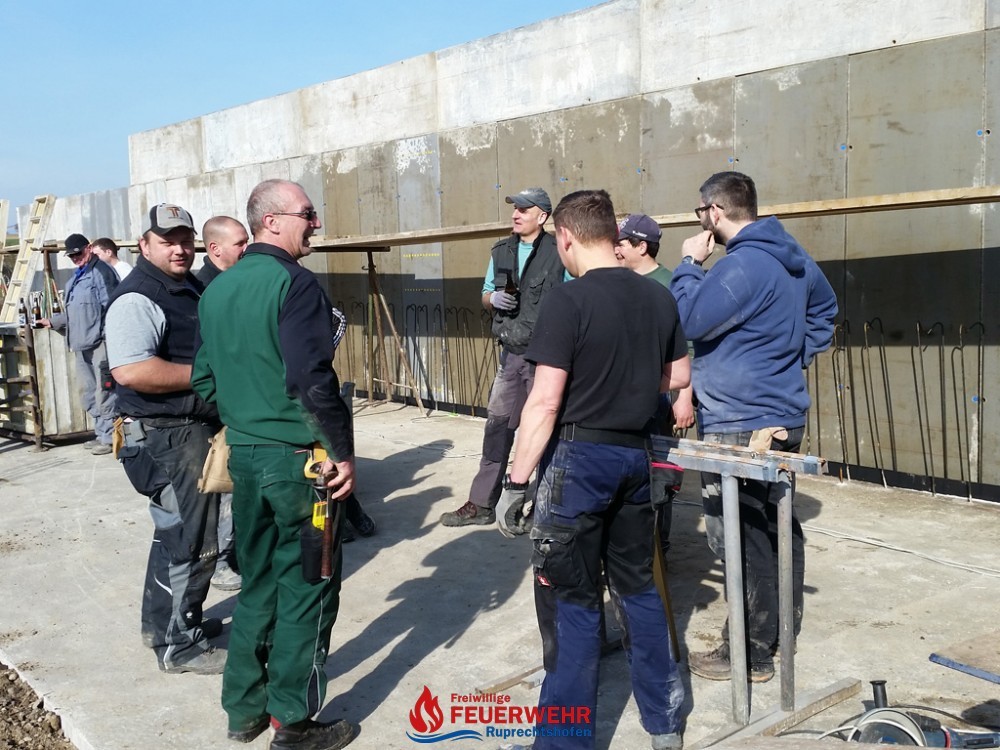 Am Samstag, den 25. März meinte es der Wettergott gut mit allen Helfern auf der Feuerwehrzubau – Baustelle. Die Schalung für die Rückwand der Halle wurde aufgestellt und das Bewährungseisen eingebunden.