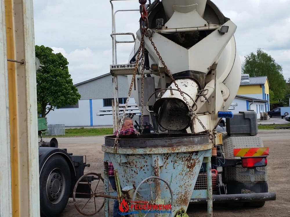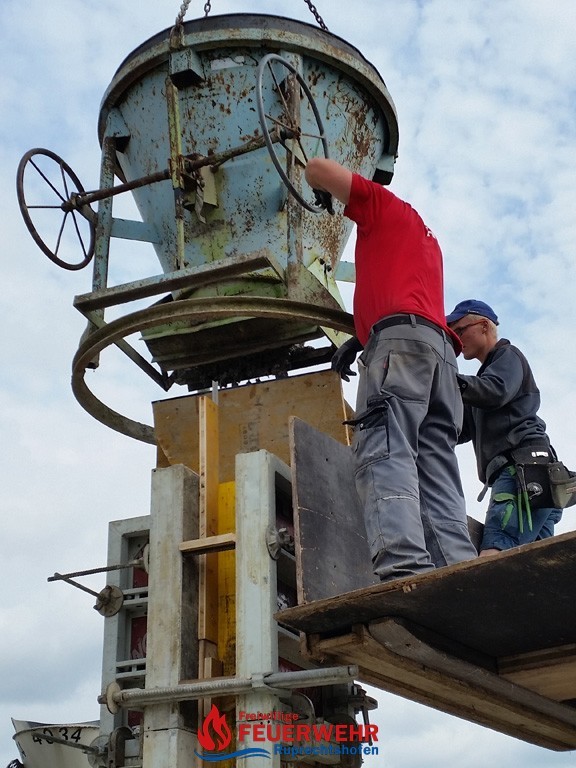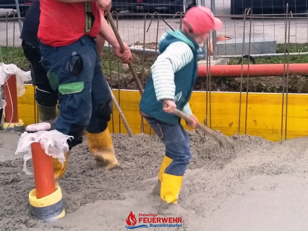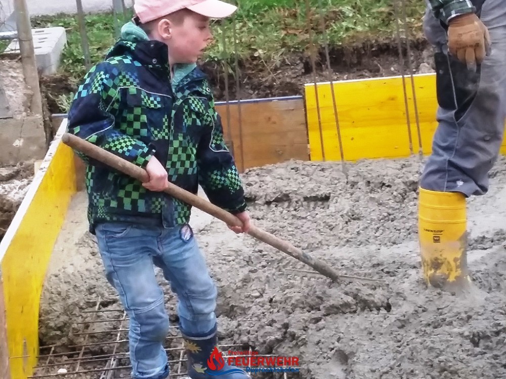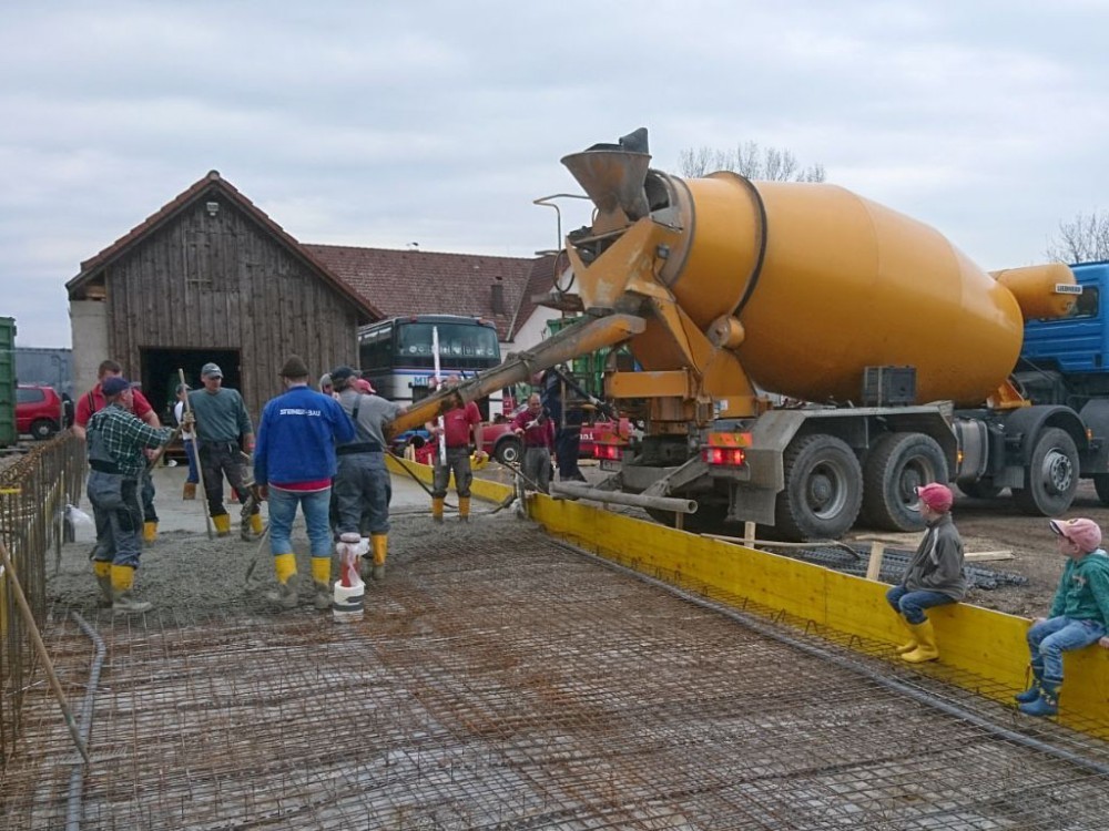Viele große und kleine Hände halfen beim Einebnen und Verteilen der Mischwagenladungen. Nach ca. 2 ½ Stunden war fertigbetoniert.