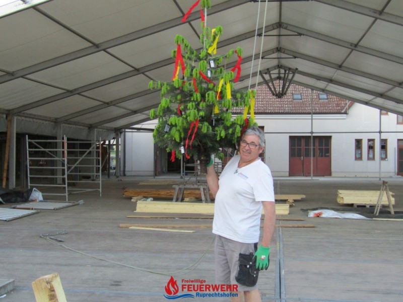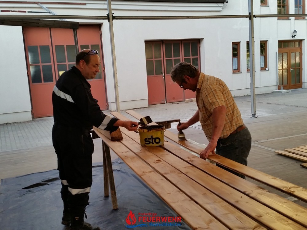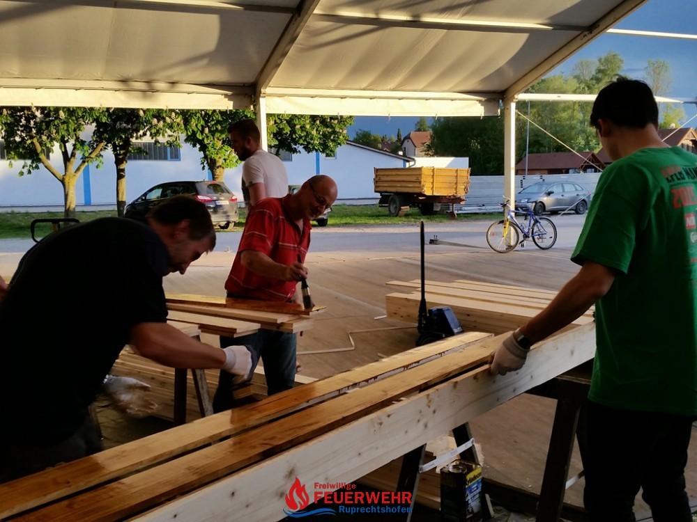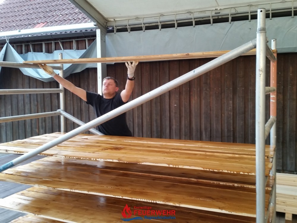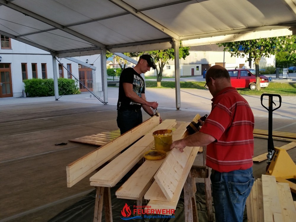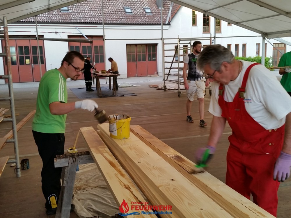 Ein großer Vorteil war, dass bereits große Teile des Festzeltes für das Pfingstgest stehen und dieser überdachte Bereich optimal für die Streicharbeiten  ist.