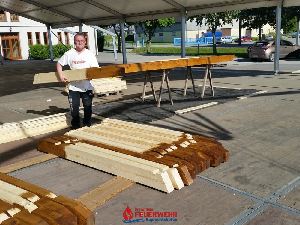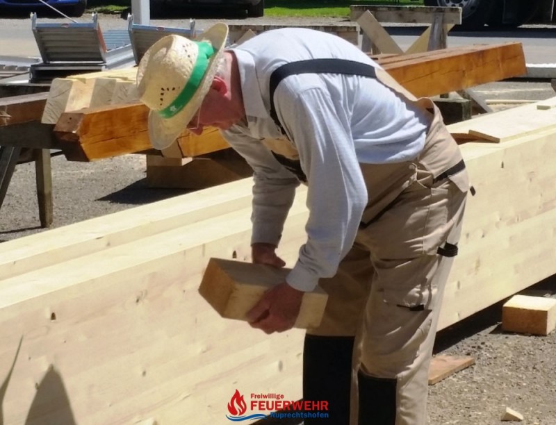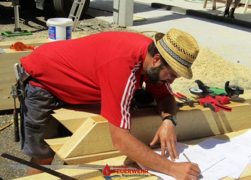 Nach allmählicher Beendigung der Streicharbeiten wurde heute begonnen, das Bauholz für den Aufbau sowie den künftigen Dachstuhl abzubinden und vorzubereiten.