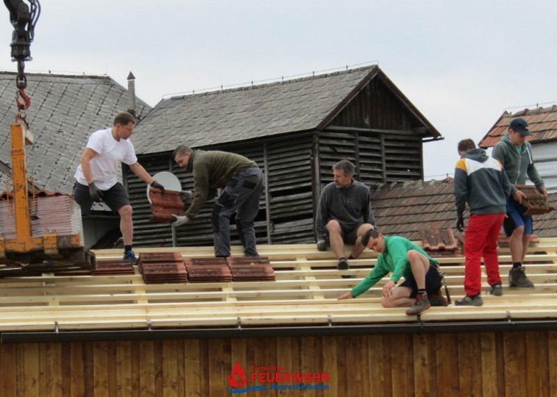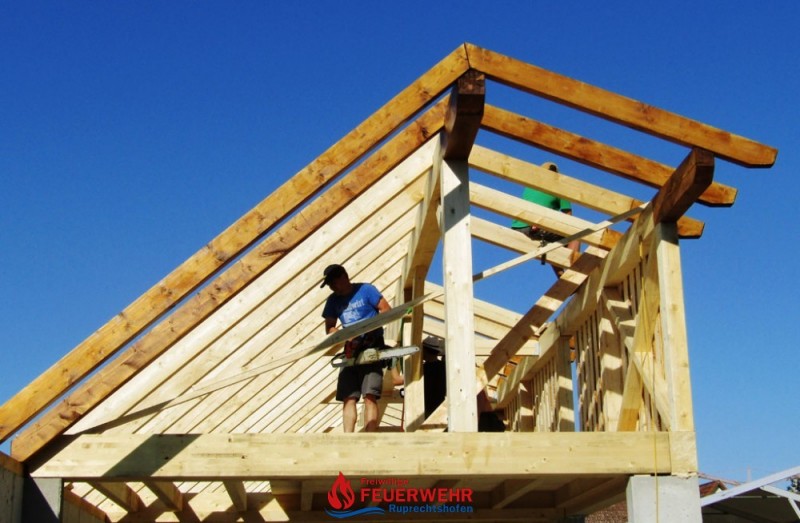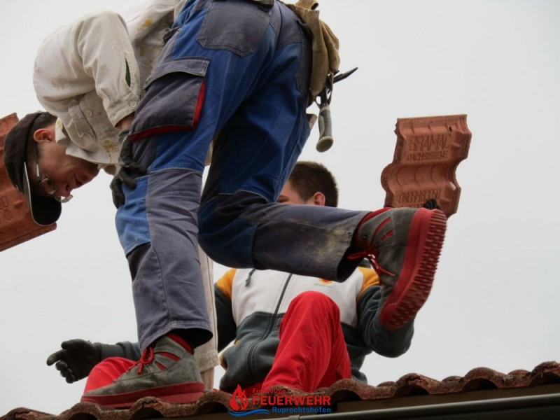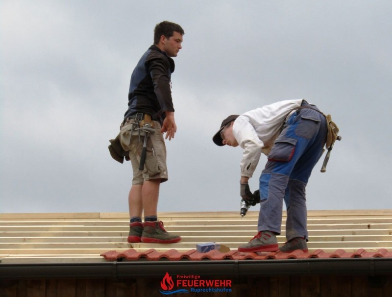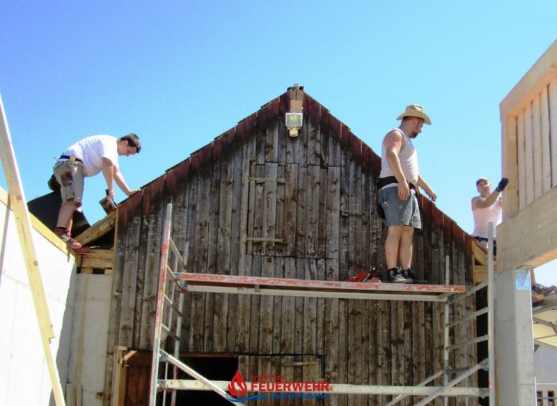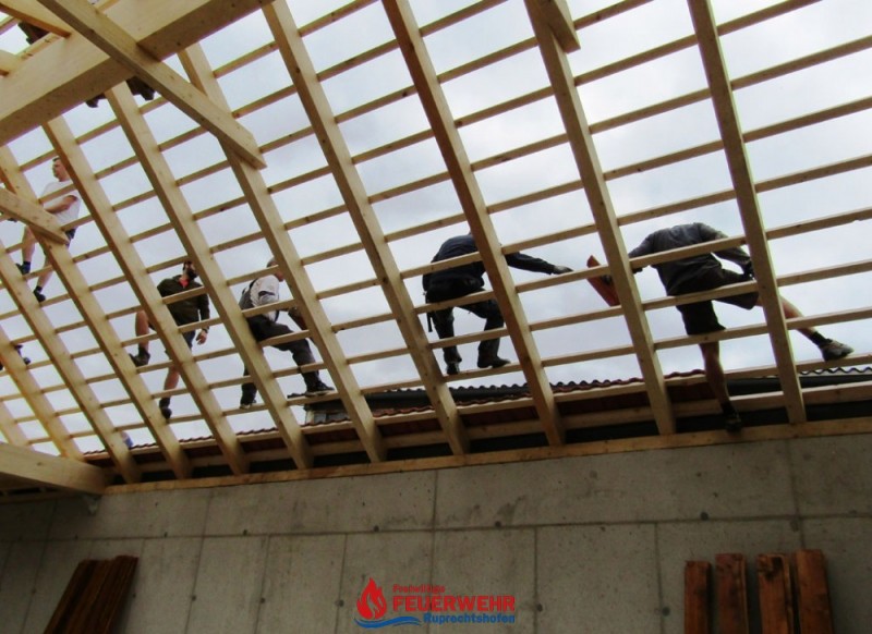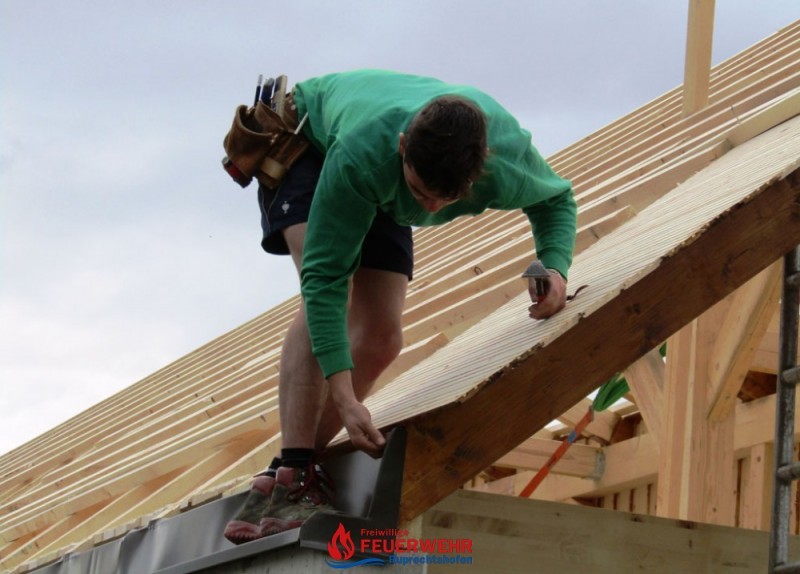 Heute galt es die Dachlattung fertigzustellen, die Giebelmauern zu schließen, das Dach einzudecken und die Anschlüsse zum bestehenden Objekt herzustellen.