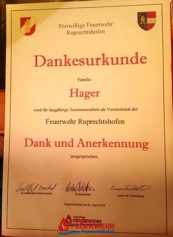 Seit 1983 diente das Gasthaus von Hermi und Hans Hager der FF-Ruprechtshofen in einem ca. vierjährigen Rhythmus als Vereinslokal.