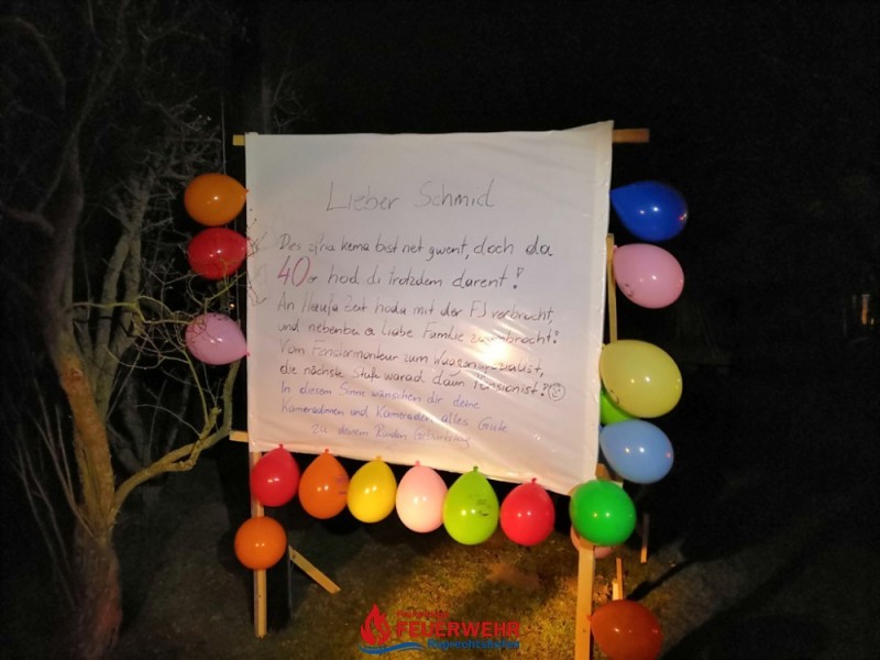 Anlässlich  des 40. Geburtstages von OLM Wolfgang Schmid  am 27. Februar 2020, stellte eine 15 köpfige Abordnung der FF-Ruprechtshofen vor dem Haus der Familie Schmid in Etzen ein Plakat auf.