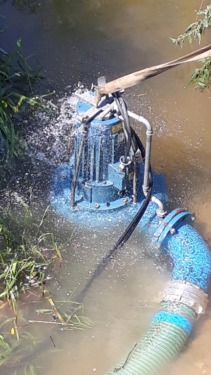 Einge Kameraden der Feuerwehr Ruprechtshofen senkten mit 2 Großpumpen und zwei weiteren B-Unterwasserpumpen den Wasserspiegel im Löschteich ab. Zirka 10.000 Liter pro Minute schaffen diese Pumpen gemeinsam.