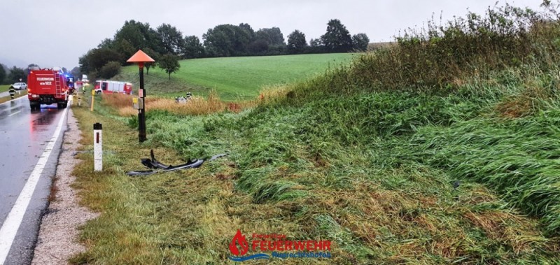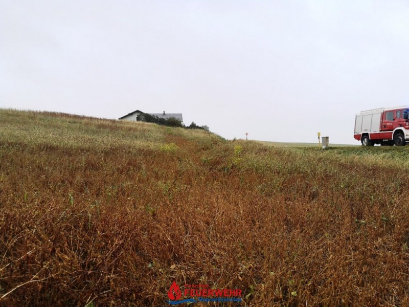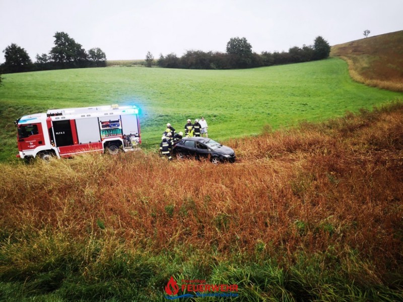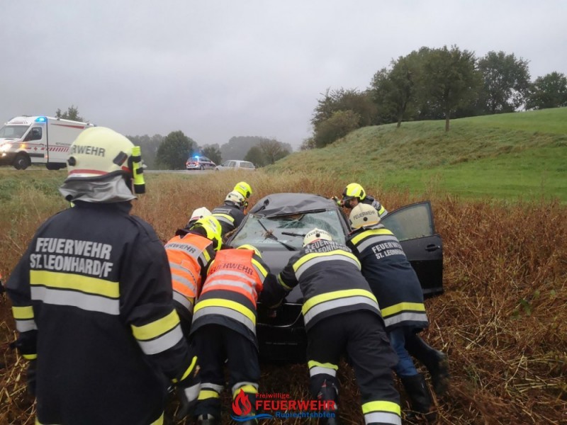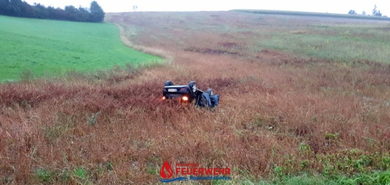Ein PKW geriet bei regennasser Fahrbahn auf der L106 offensichtlich ins Schleudern und von der Straße ab. Nach einigen Metern kam der PKW in einem angrenzenden Feld auf dem Dach liegend, zum Stillstand.
