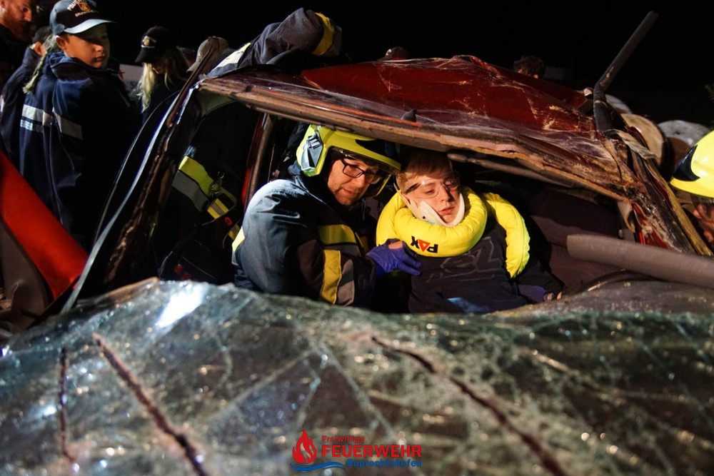 Im Anschluss an die Jugendübung beübte die Aktivmannschaft das vorgegebene Übungsszenario und führte die Menschenrettung durch. Dabei konnte die Feuerwehrjugend den Aktiven aus nächster Nähe über die Schultern schauen und so noch weitere, wertvolle Informationen gewinnen.