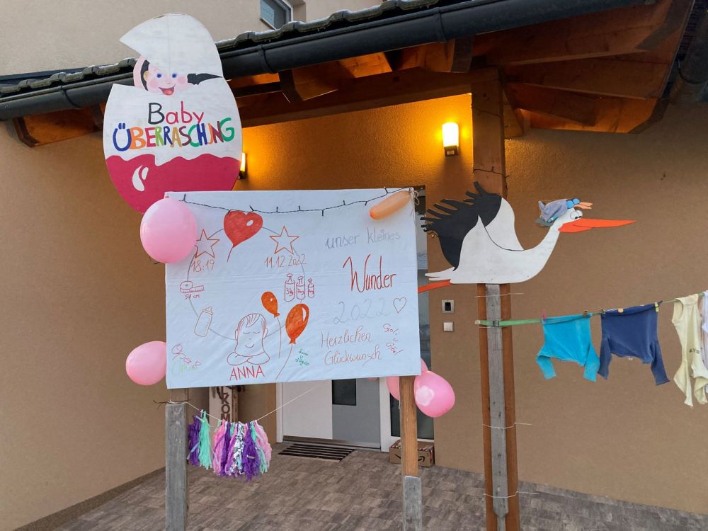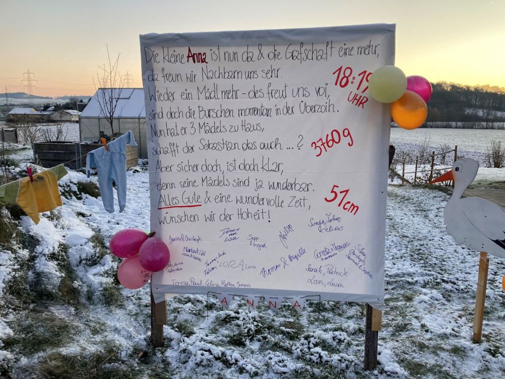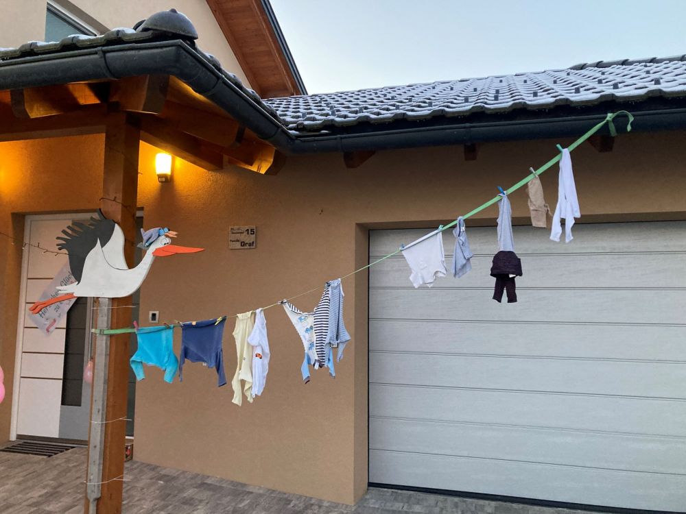 Auch viele Freunde, Bekannte, ArbeitskollegInnen und Nachbarn waren gekommen um rund ums Haus ein paar Plakate anzubringen und auf das Wohl der jungen Familie Graf anzustoßen.