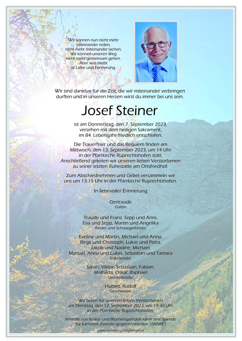 Unsere aufrichtige Anteilnahme gilt seiner Gattin Gertraude, seinen Kindern, Schwiegerkindern Enkeln und Urenkeln!