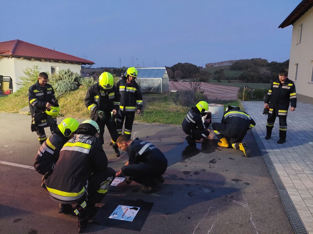 Bei dieser Freitagübung wurden zuerst im Theorieteil und danach im Praxisteil die allgemeingültigen Basics und das Vorgehen bei Einsätzen mit Schadstoffen geschult.