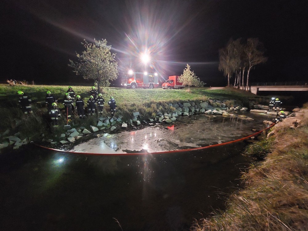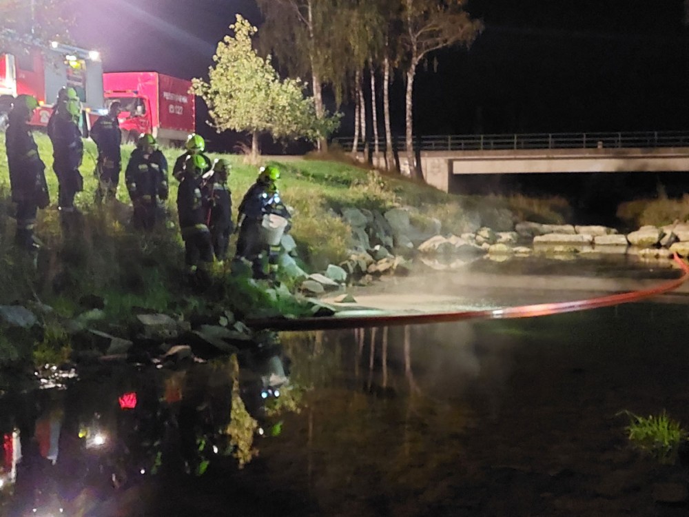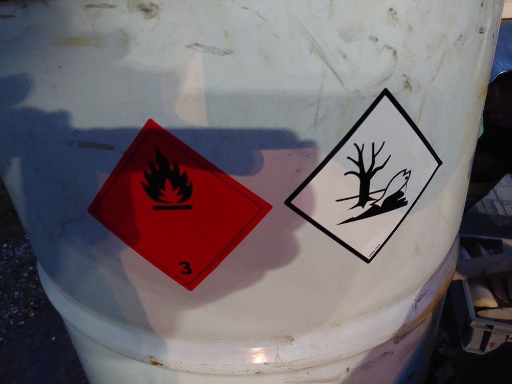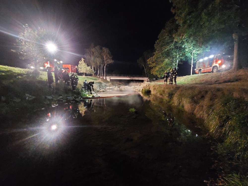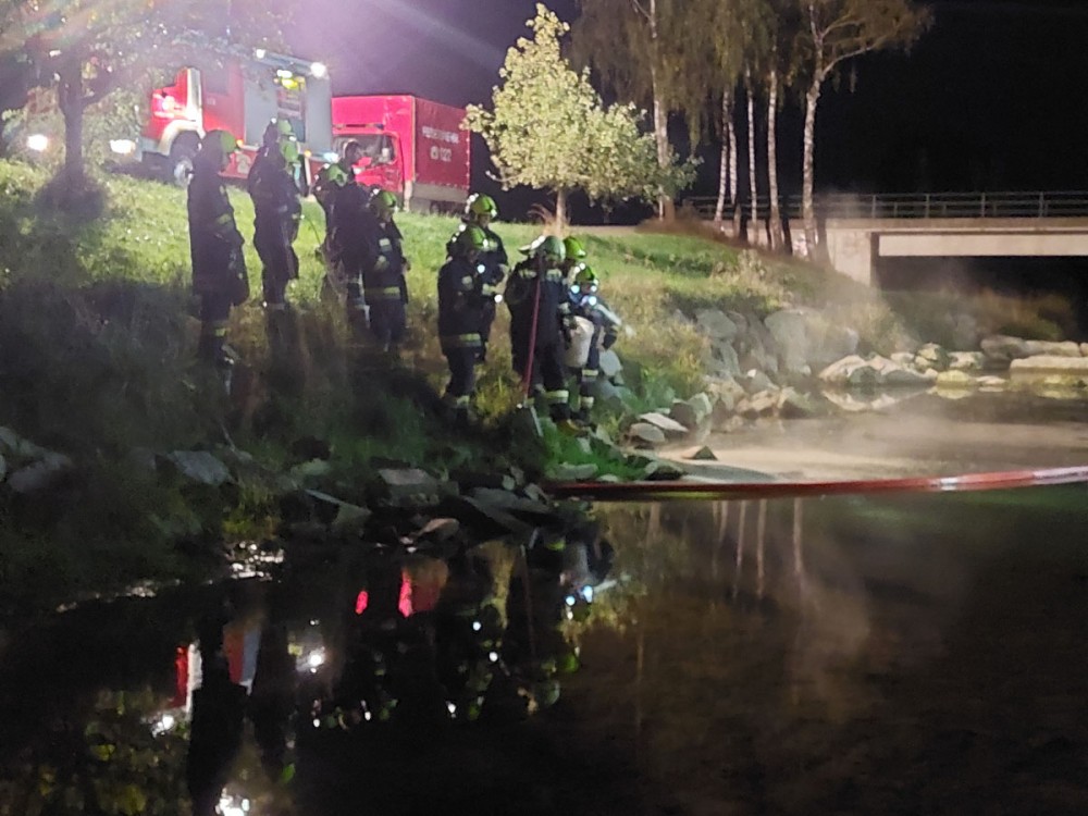 Von einem größeren Fass ist eine brennbare, umweltgefährdende Flüssigkeit ausgetreten und danach über den Regenwasserkanal (Dachrinnenabläufe und Oberflächenwasser) in den Melkfluß gelangt.