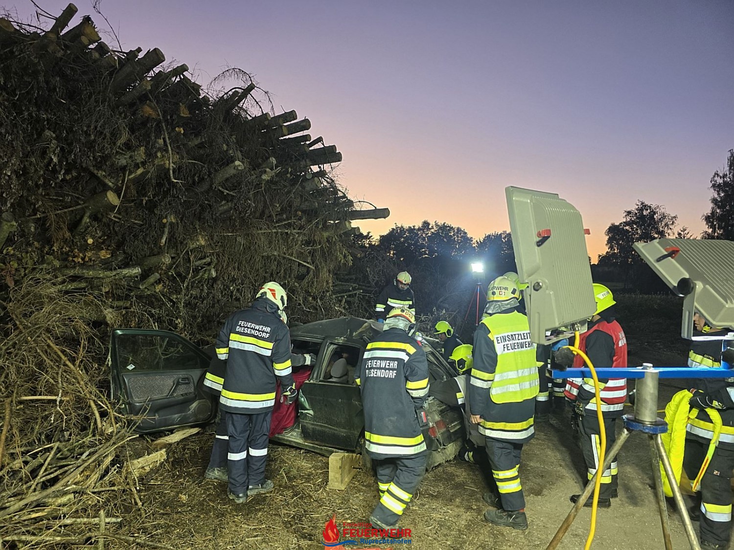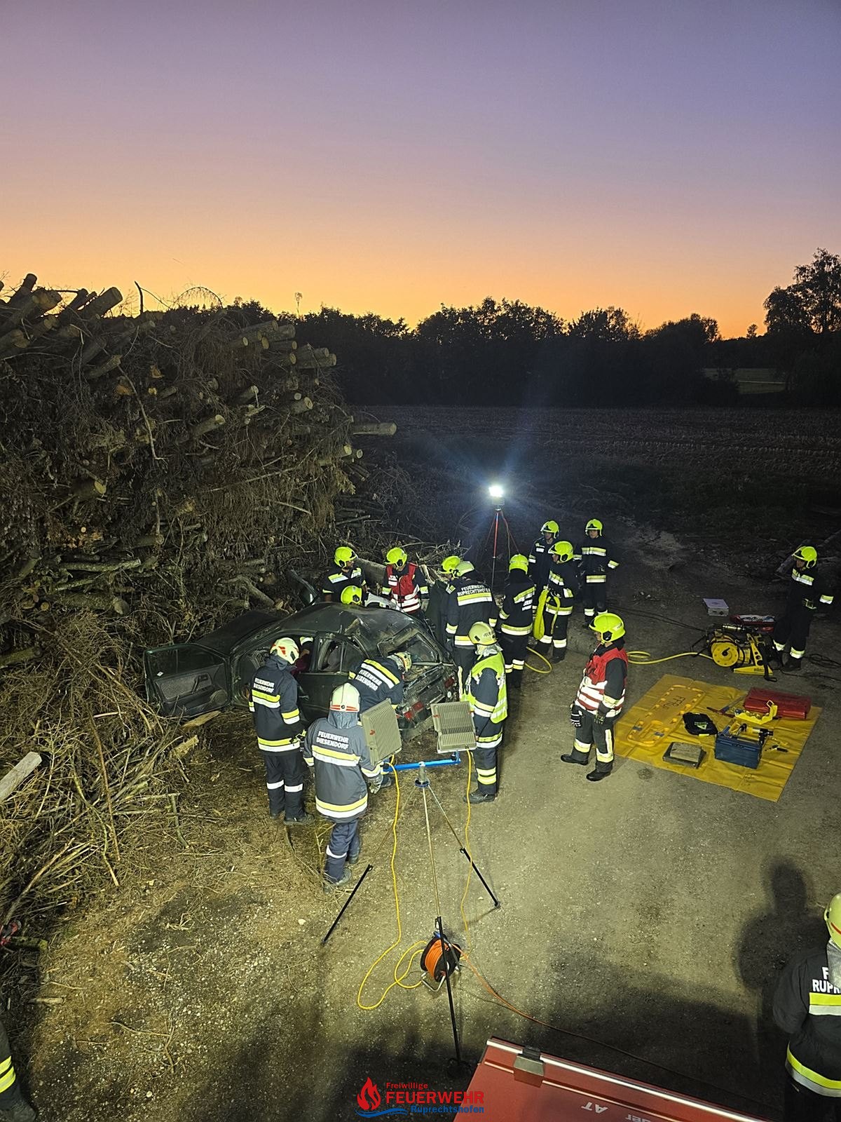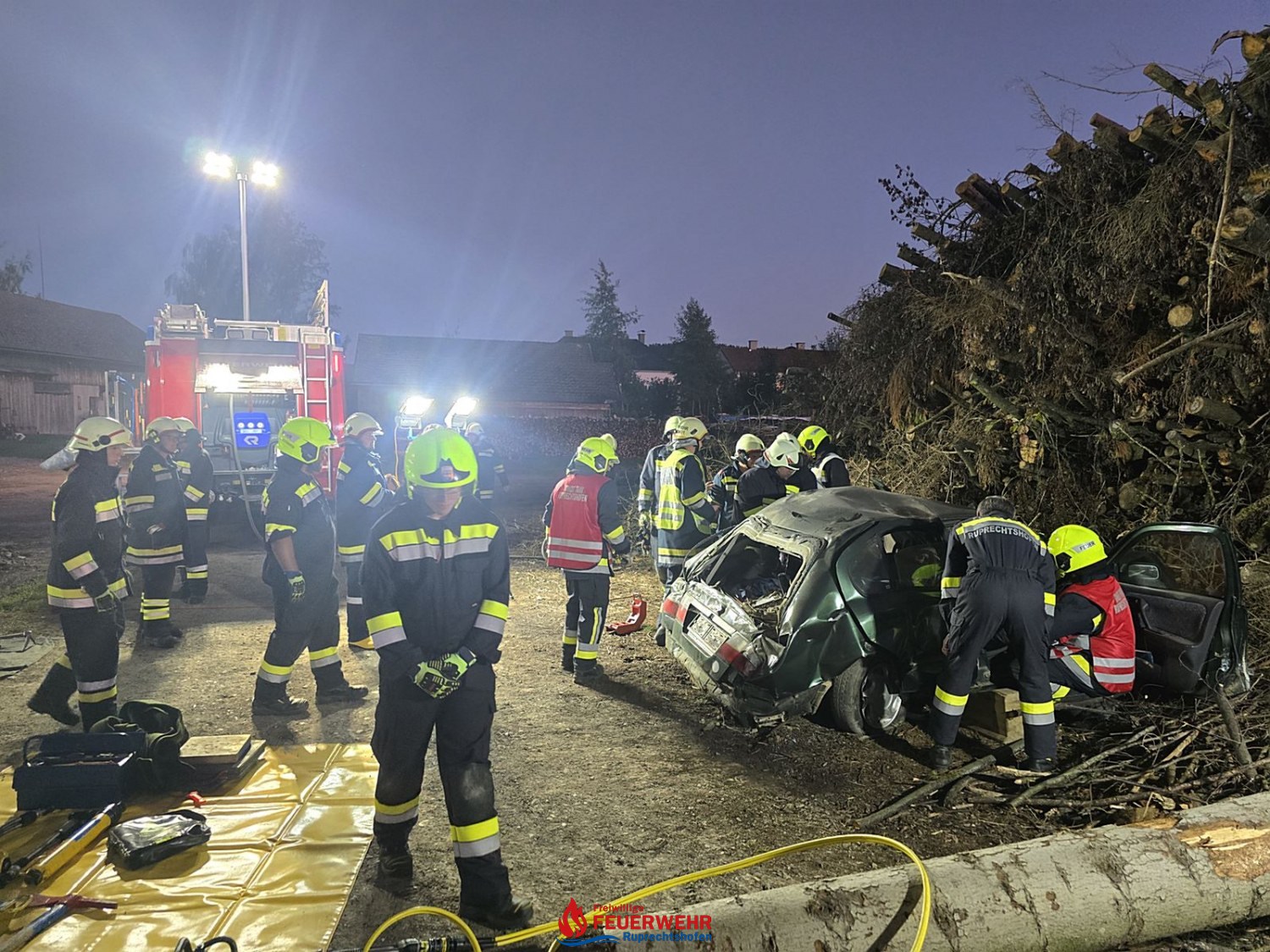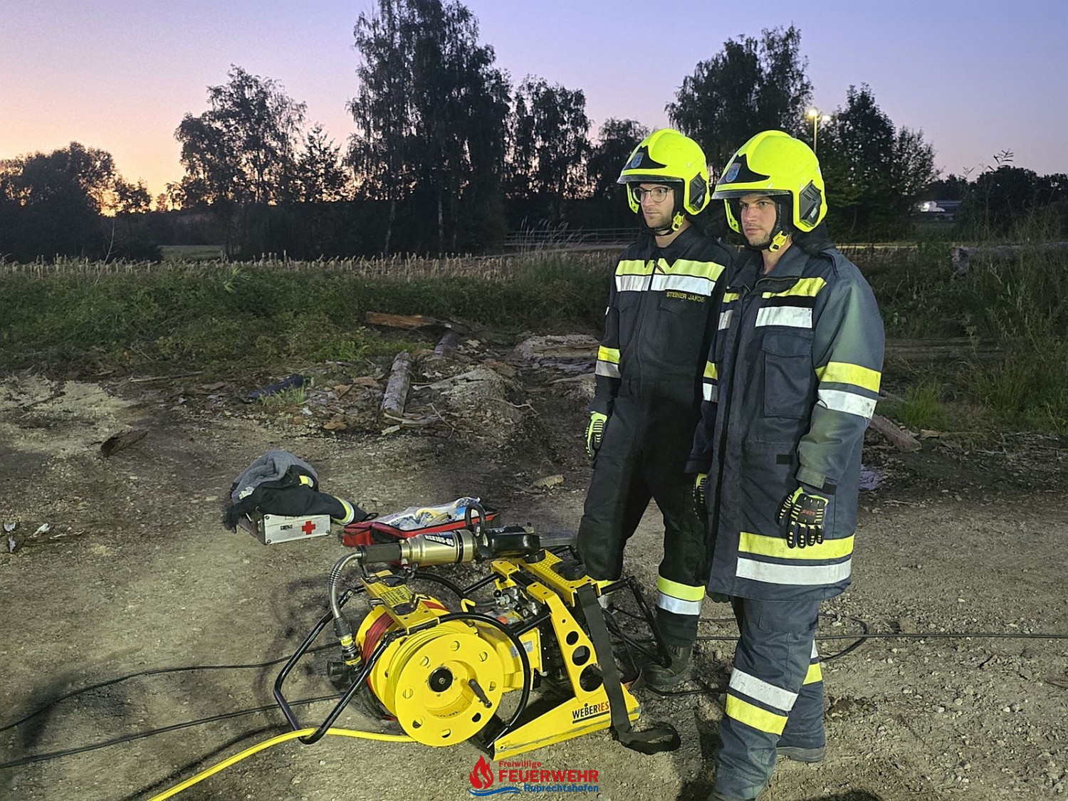 Die zwei Personen im Unfallfahrzeug, der Fahrer und der Beifahrer sollten gleichzeitig mit zwei hydraulischen Rettungsgeräten aus dem Fahrzeug gerettet werden.