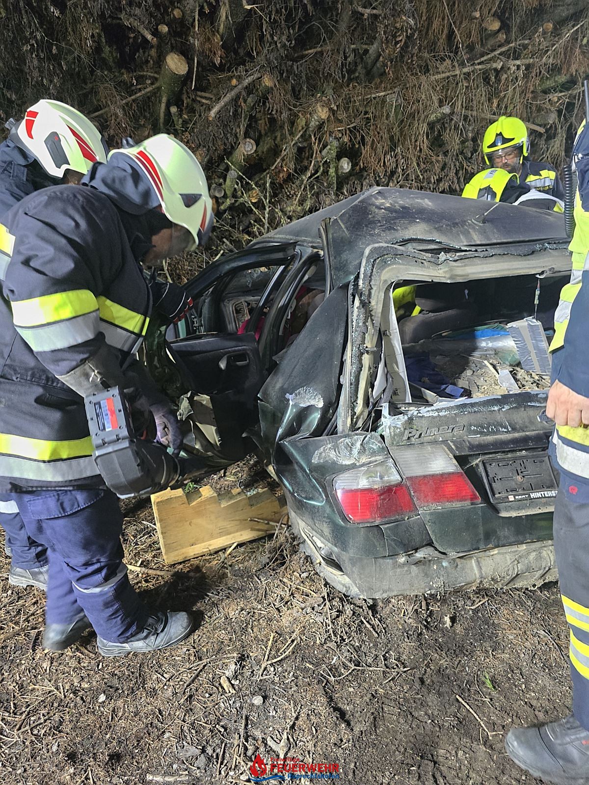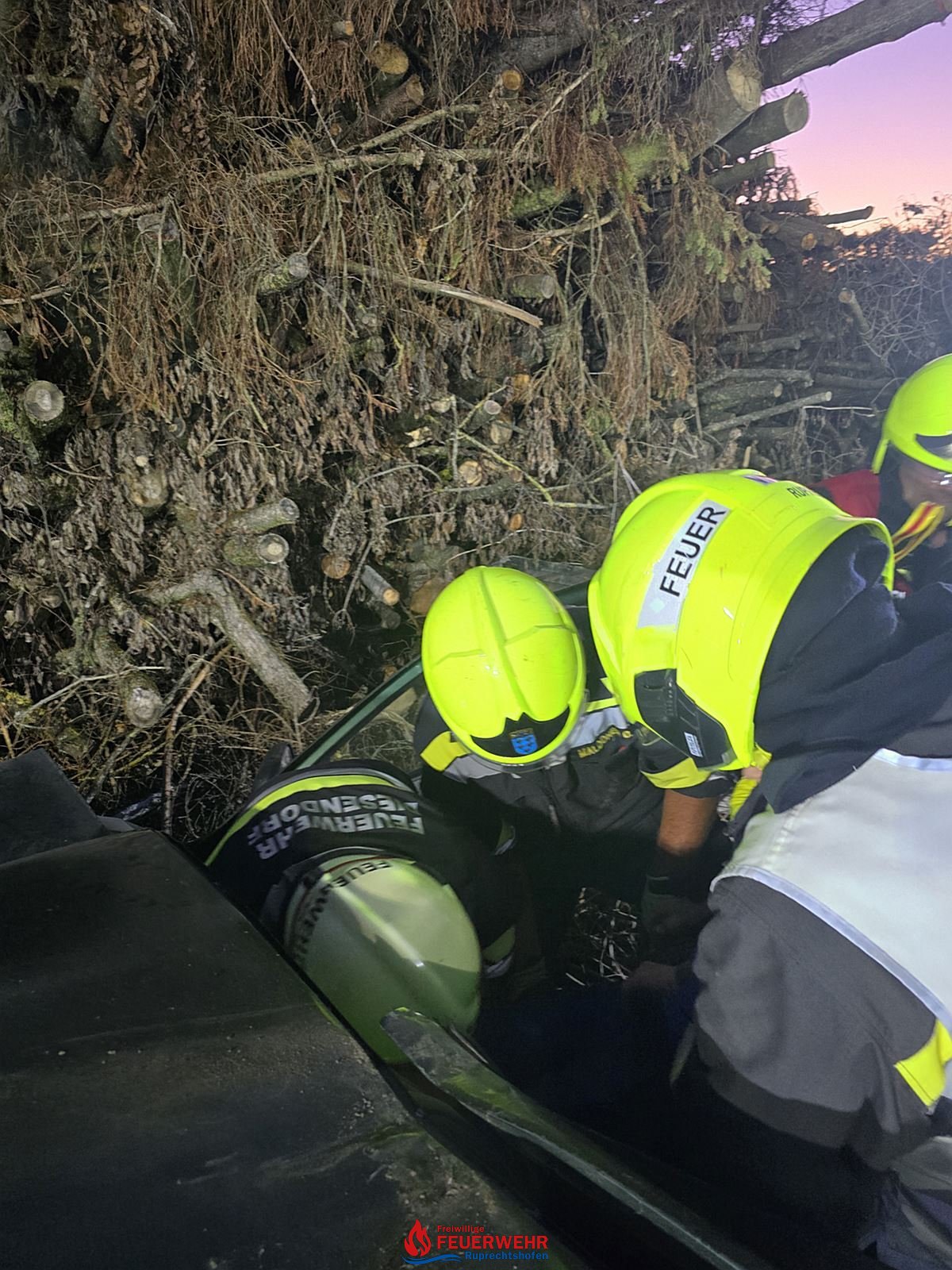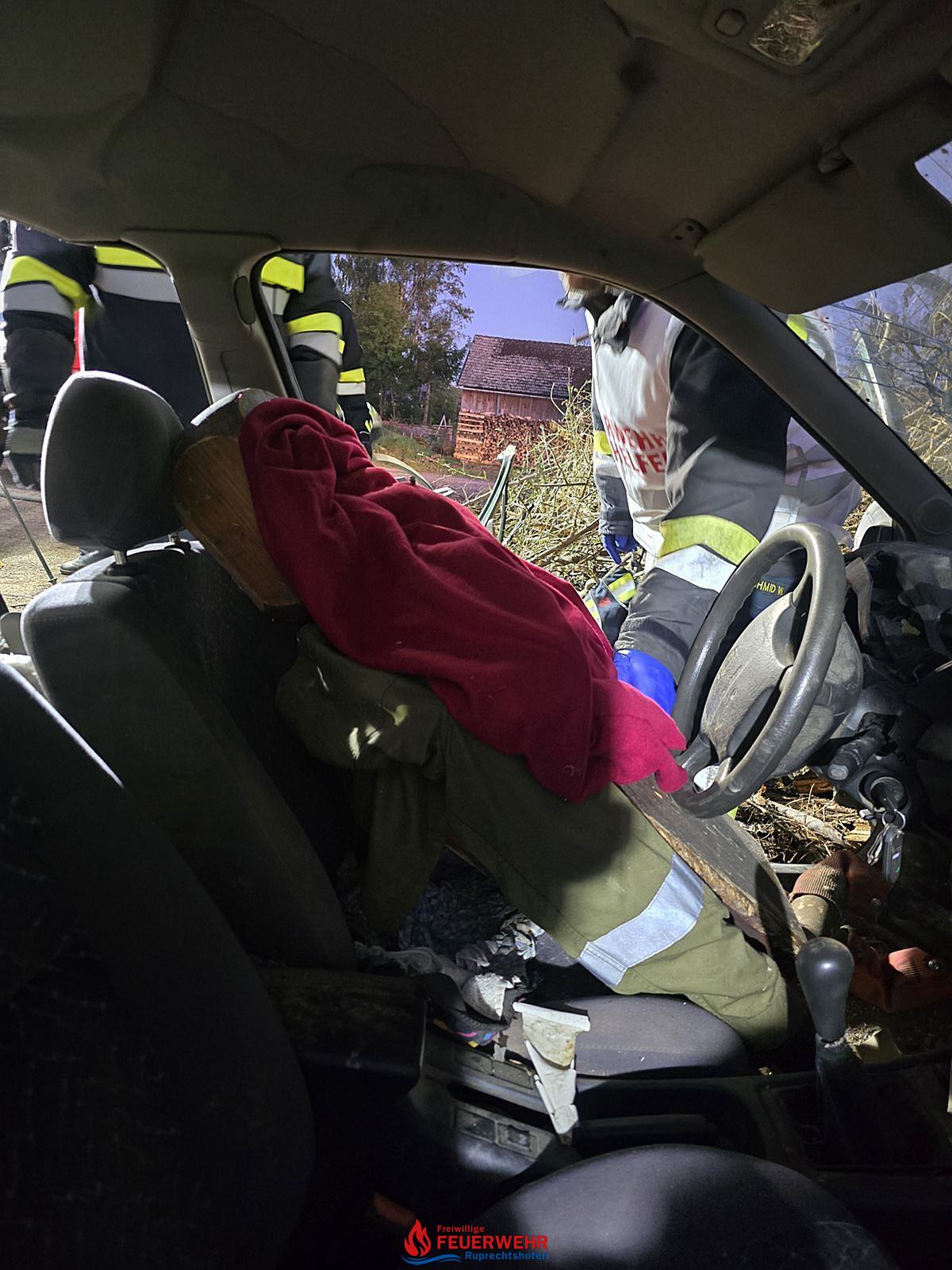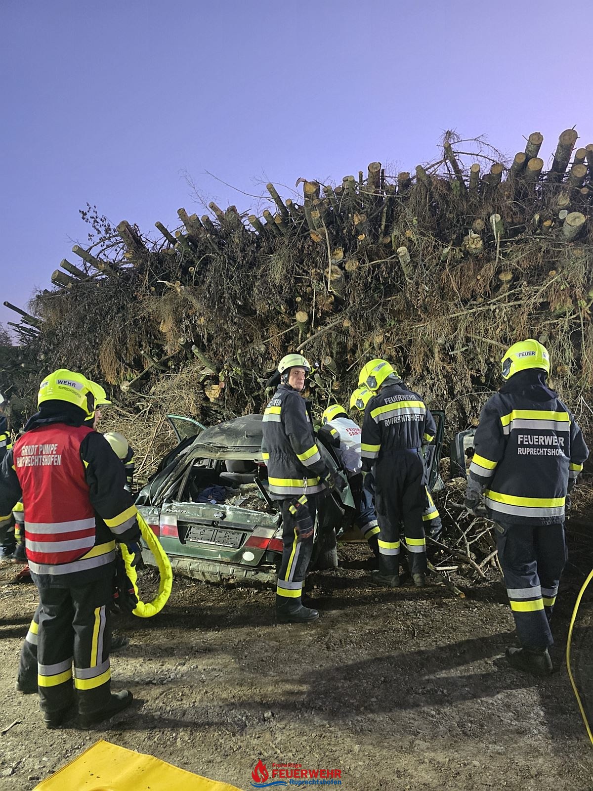 Die zwei Personen im Unfallfahrzeug, der Fahrer und der Beifahrer sollten gleichzeitig mit zwei hydraulischen Rettungsgeräten aus dem Fahrzeug gerettet werden.