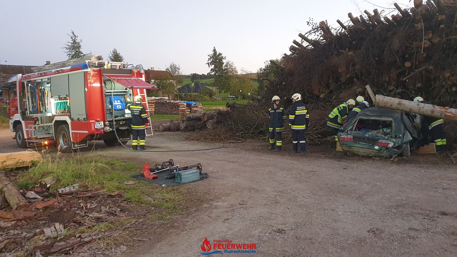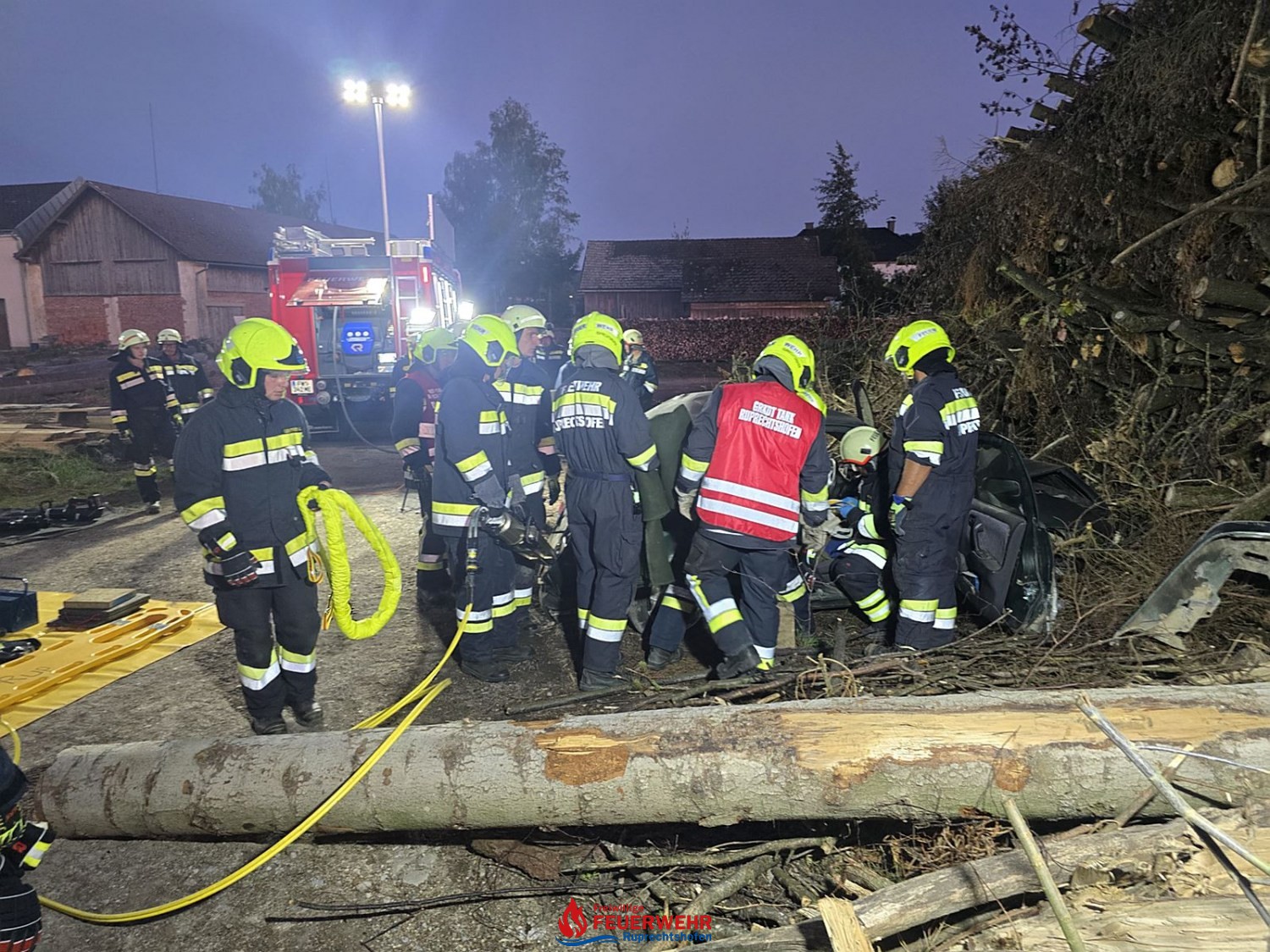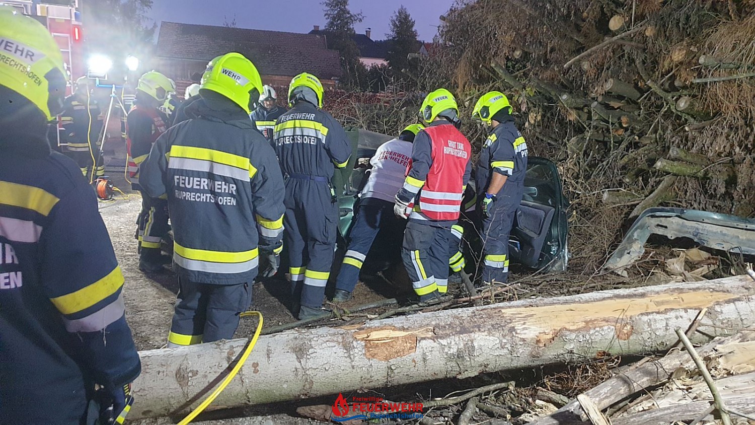 Der Baum, der auf dem Autodach lag, wurde schnellstmöglich, also händisch, so wie auch wenn möglich im Ernstfall, von mehreren Mann entfernt.