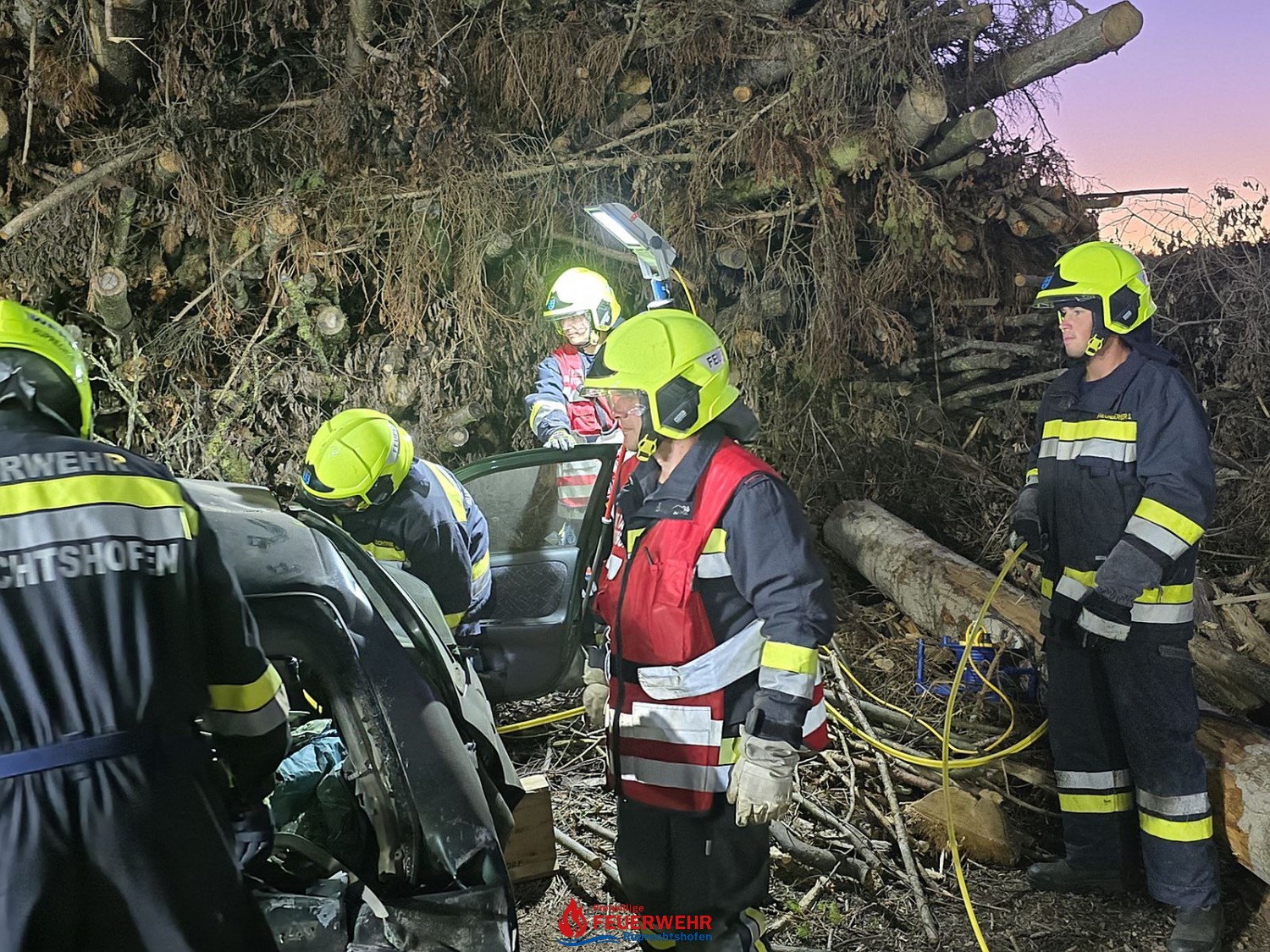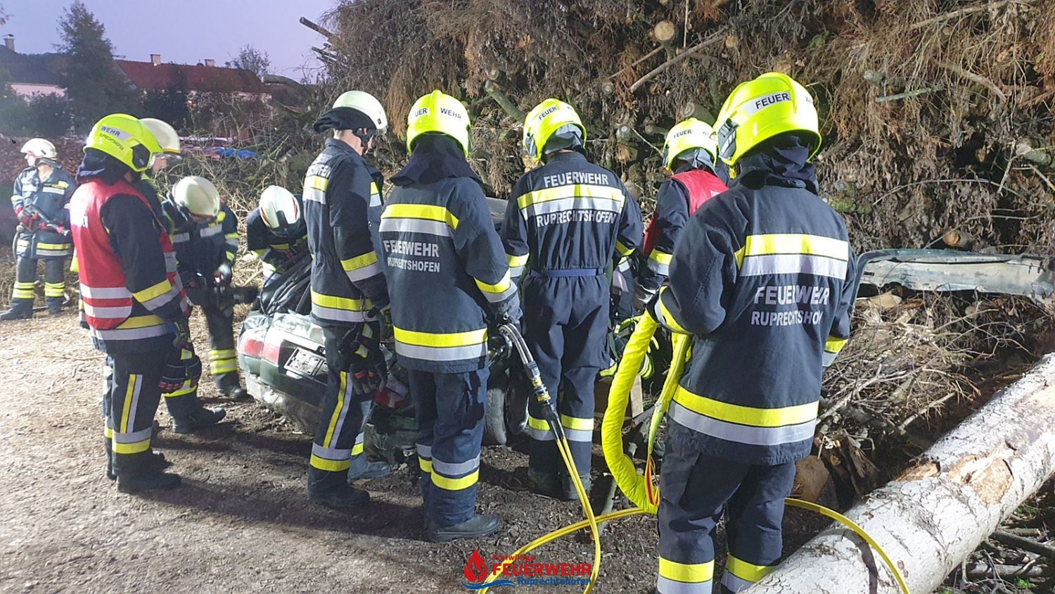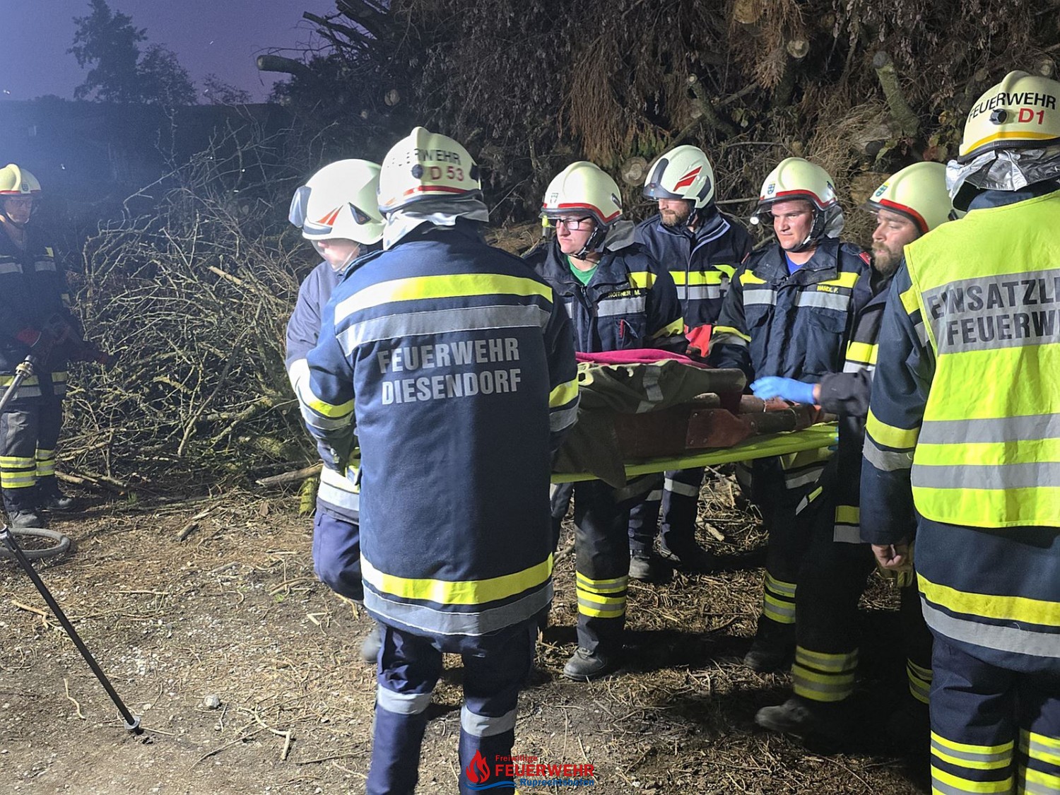 Der Baum, der auf dem Autodach lag, wurde schnellstmöglich, also händisch, so wie auch wenn möglich im Ernstfall, von mehreren Mann entfernt.