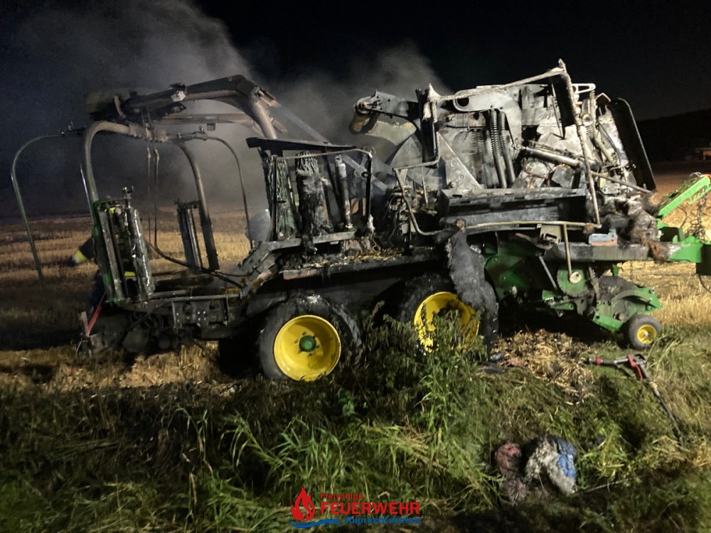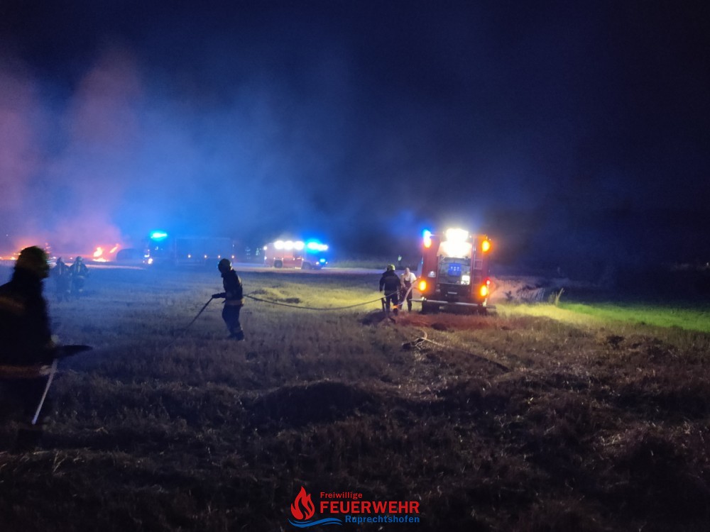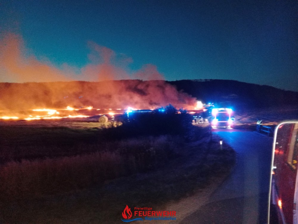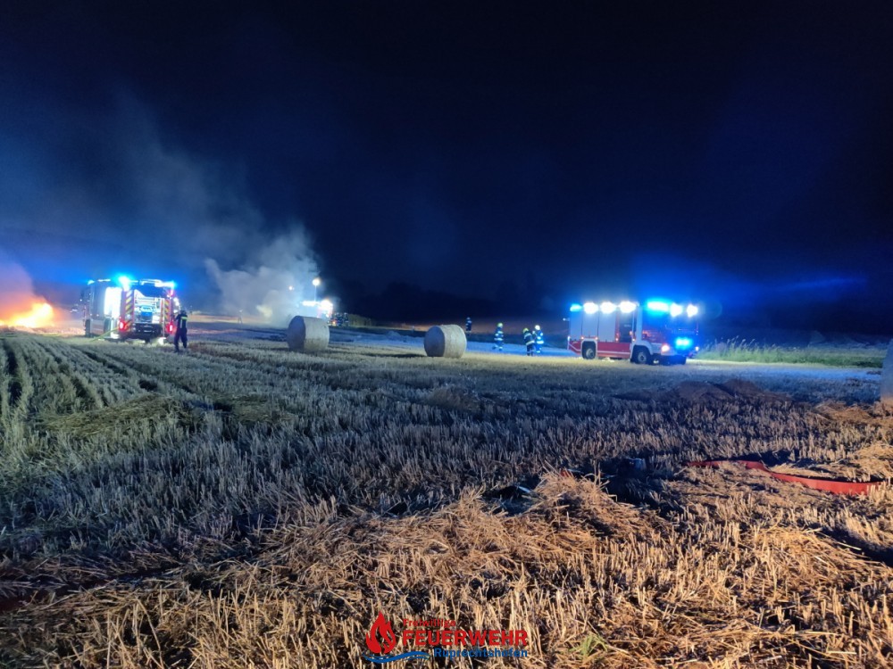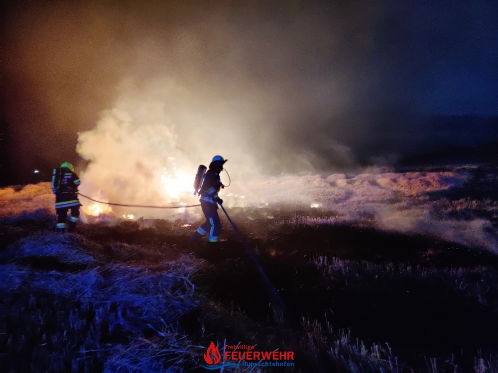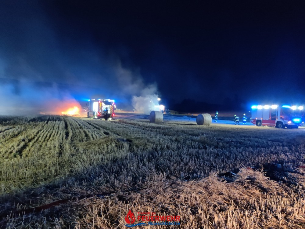 Die Strohpresse stand in Vollbrand und an anderen Stellen brannten gepresste Strohballen, sowie das Stoppelfeld selbst.