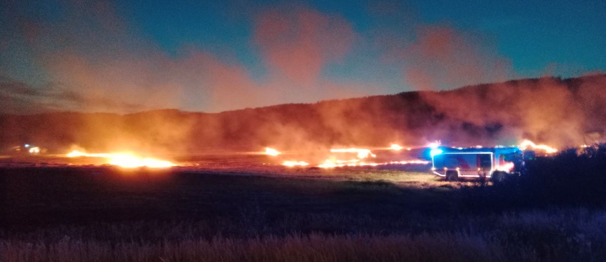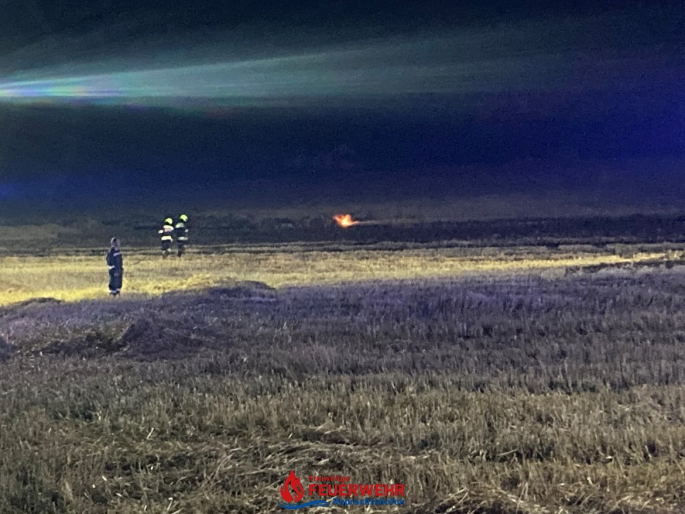 Beim Eintreffen der Feuerwehr bot sich den Fahrzeugbesatzungen ein schauriger Anblick auf ein weitläufiges, frisch abgedroschenes Feld, auf dem es an vielen Stellen gleichzeitig brannte.