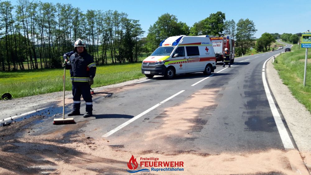 Wir konnten bei der Versorgung von Unfallteilnehmern (darunter 1 Kleinkind) helfen und beim Aufbringen von Ölbindemittel auf die stark verschmutzte Fahrbahn tätig werden.